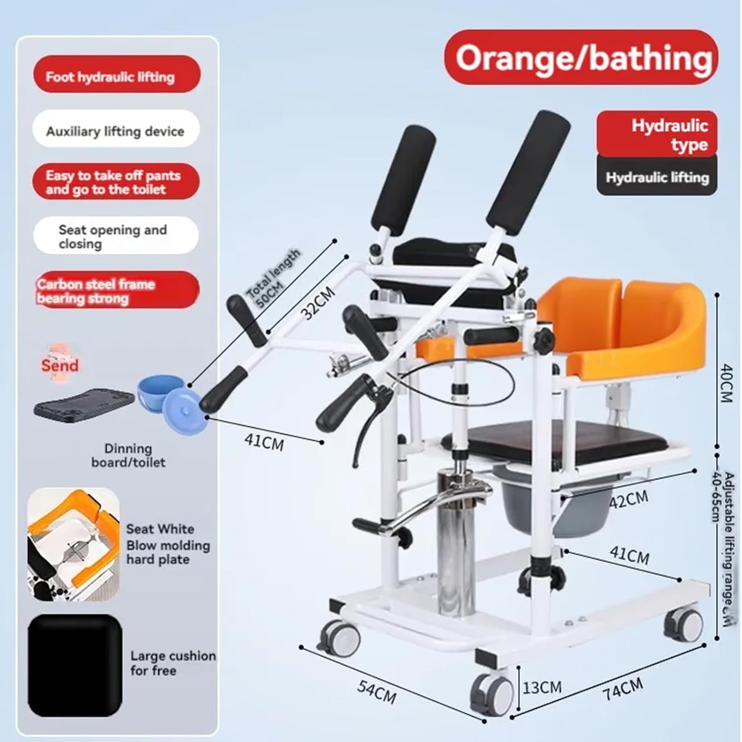 The Transfer Lift Chair for Home, Hydraulic Patient Lift Wheelchair is a mobility and care support device designed to safely move patients between beds, chairs, toilets, and wheelchairs. It uses a hydraulic lifting system, meaning it works smoothly without electricity, making it reliable, quiet, and easy to use in homes, hospitals, and care facilities.